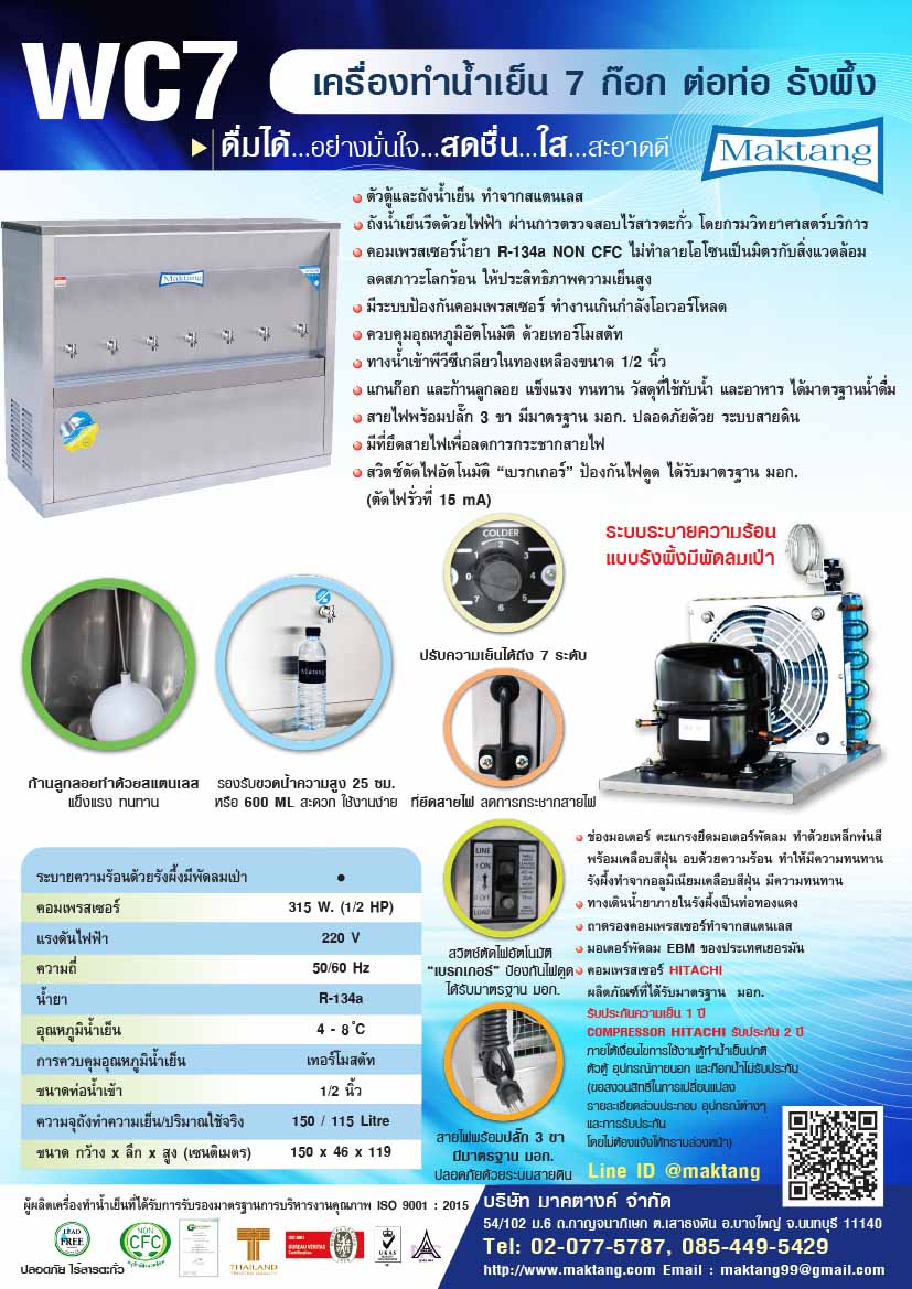 - ตู้กดน้ำดื่ม รุ่น WC7 ก๊อกน้ำเย็น 7 ก๊อก ใช้คอมเพรสเซอร์ HITACHI 380 W. (1/2 Hp.) อุณหภูมิน้ำเย็น 4-8 องศาเซลเซียส ความจุถังน้ำเย็น 150 Lใช้จริง 115 L ขนาด (ก x ล x ส) 150 x 46 x 119 ซม.