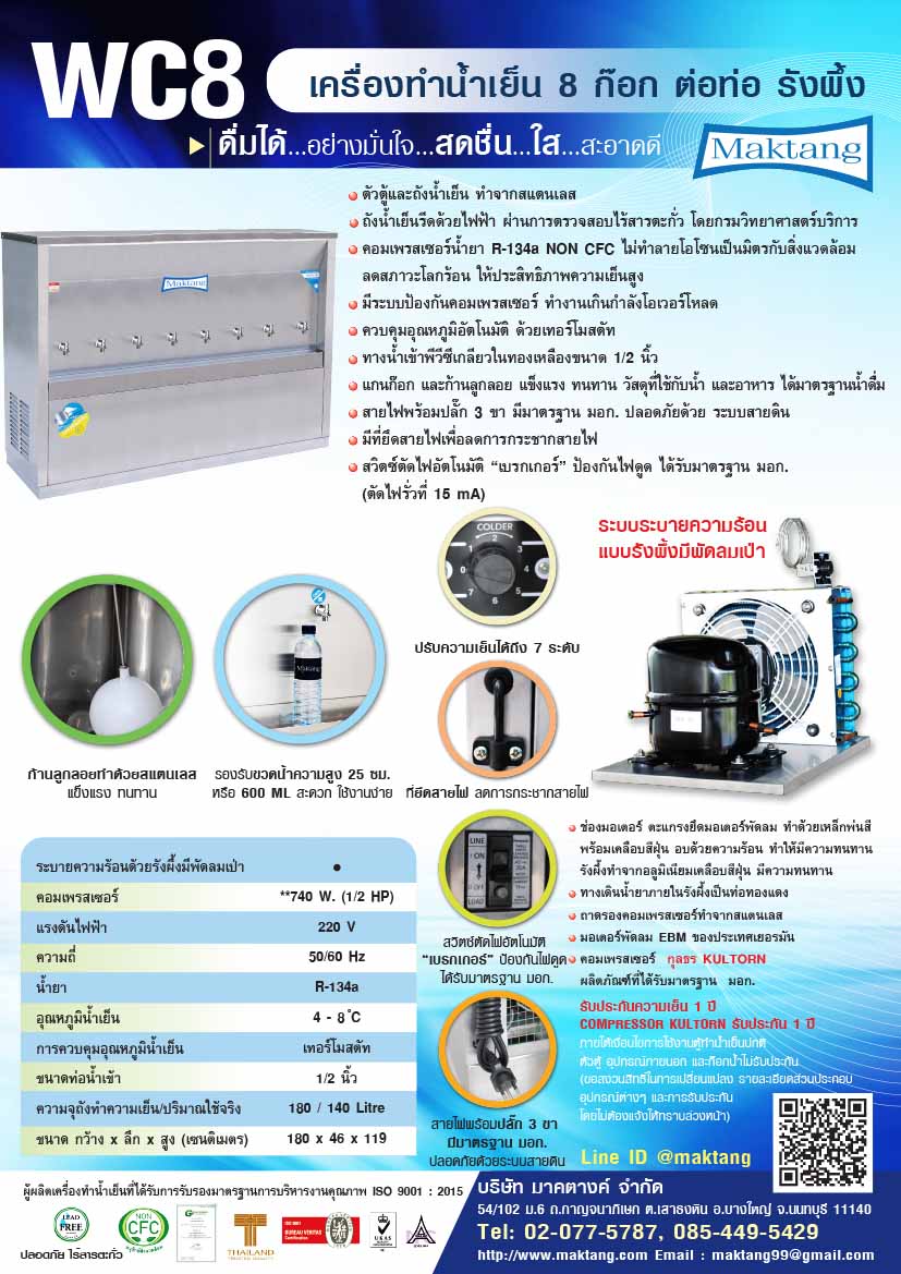 - ตู้กดน้ำดื่ม รุ่น WC8 ก๊อกน้ำเย็น 8 ก๊อก ใช้คอมเพรสเซอร์ HITACHI 740 W. (1Hp.) อุณหภูมิน้ำเย็น 4-8 องศาเซลเซียส ความจุถังน้ำเย็น 180 Lใช้จริง 145 L ขนาด (ก x ล x ส) 180 x 46 x 119 ซม.