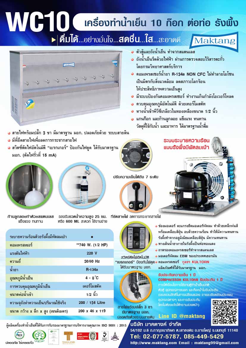 - ตู้กดน้ำดื่ม รุ่น WC10 ก๊อกน้ำเย็น 10 ก๊อก ใช้คอมเพรสเซอร์ HITACHI 740 W.(1Hp.) อุณหภูมิน้ำเย็น 4-8 องศาเซลเซียส ความจุถังน้ำเย็น 180 Lใช้จริง 145 L ขนาด (ก x ล x ส) 180 x 46 x 119 ซม.
