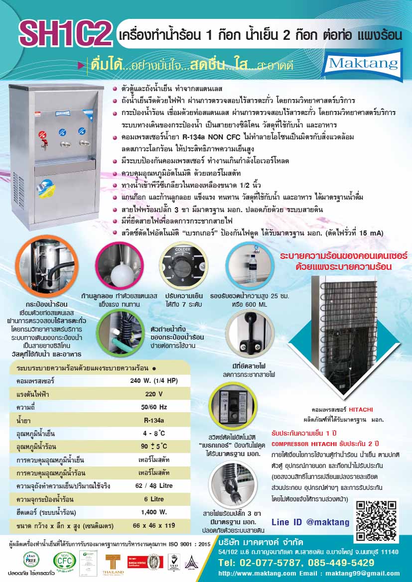 - ตู้ทำน้ำร้อน น้ำเย็น รุ่น SH1C2 มีก๊อกน้ำร้อน 1 ก๊อก ก๊อกน้ำเย็น 2 ก๊อก ใช้คอมเพรสเซอร์ HITACHI 160 W. (1/5 Hp.) อุณหภูมิน้ำเย็น 4-8 องศาเซลเซียส ความจุถังน้ำเย็น 59 Lt.ใช้ได้จริง 38 Lt.ใช้ฮิตเตอร์ 1400 W.อุณหภูมิน้ำร้อน 90+-5 องศาเซลเซียส ความจุถังน้ำร้อน 6 Lt. ขนาด (ก x ล x ส) 66 x 46 x 119 ซม.