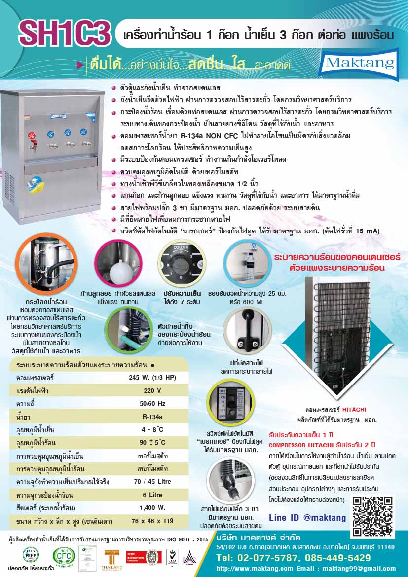 - ตู้ทำน้ำร้อน น้ำเย็น รุ่น SH1C3 มีก๊อกน้ำร้อน 1 ก๊อก ก๊อกน้ำเย็น 3 ก๊อก ใช้คอมเพรสเซอร์ HITACHI 270 W. (1/3 Hp.) อุณหภูมิน้ำเย็น 4-8 องศาเซลเซียส ความจุถังน้ำเย็น 70 Lt.ใช้ได้จริง 45 Lt.ใช้ฮิตเตอร์ 1400 W.อุณหภูมิน้ำร้อน 90+-5 องศาเซลเซียส ความจุถังน้ำร้อน 6 Lt. ขนาด (ก x ล x ส) 76 x 46 x 119 ซม.