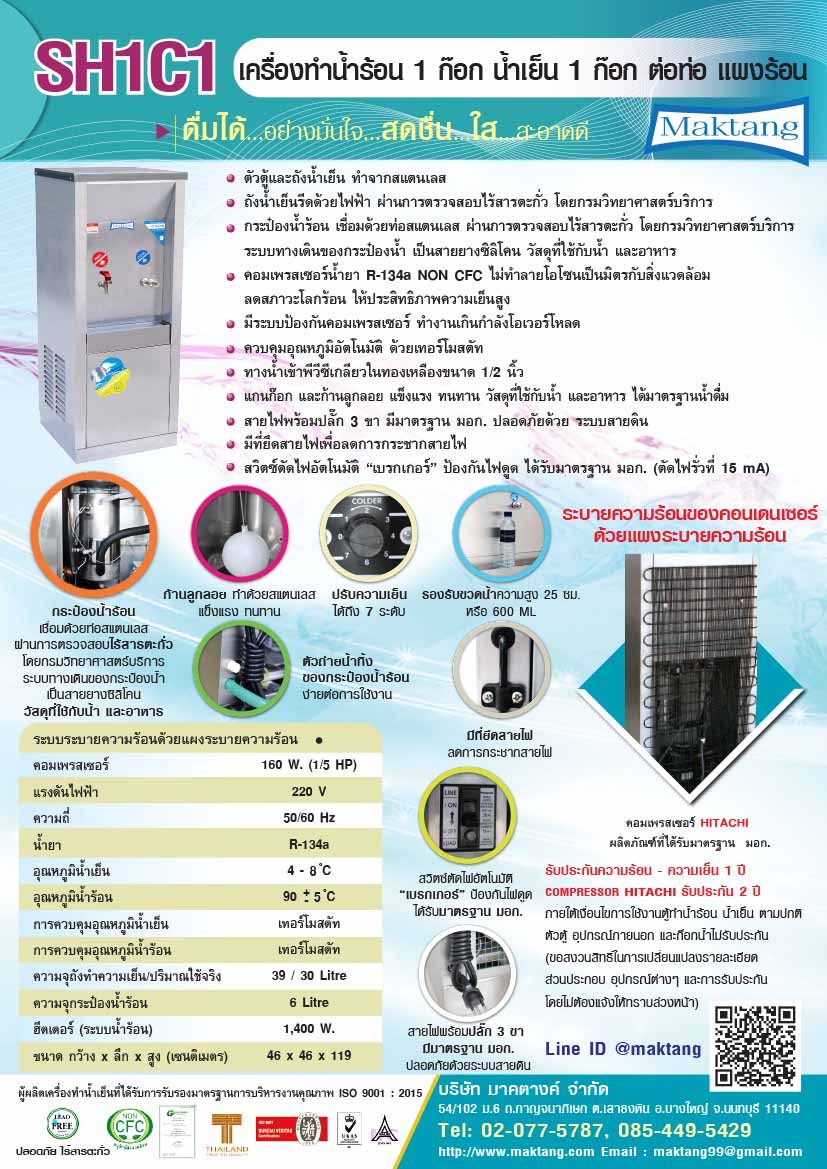 - ตู้ทำน้ำร้อน น้ำเย็น รุ่น SH1C1 มีก๊อกน้ำร้อน 1 ก๊อก ก๊อกน้ำเย็น 1 ก๊อก ใช้คอมเพรสเซอร์ HITACHI 160 W. (1/5 Hp.) อุณหภูมิน้ำเย็น 4-8 องศาเซลเซียส ความจุถังน้ำเย็น 37 Lt.ใช้ได้จริง 24 Lt.ใช้ฮิตเตอร์ 1400 W.อุณหภูมิน้ำร้อน 90+-5 องศาเซลเซียส ความจุถังน้ำร้อน 6 Lt. ขนาด (ก x ล x ส) 46 x 46 x 119 ซม.