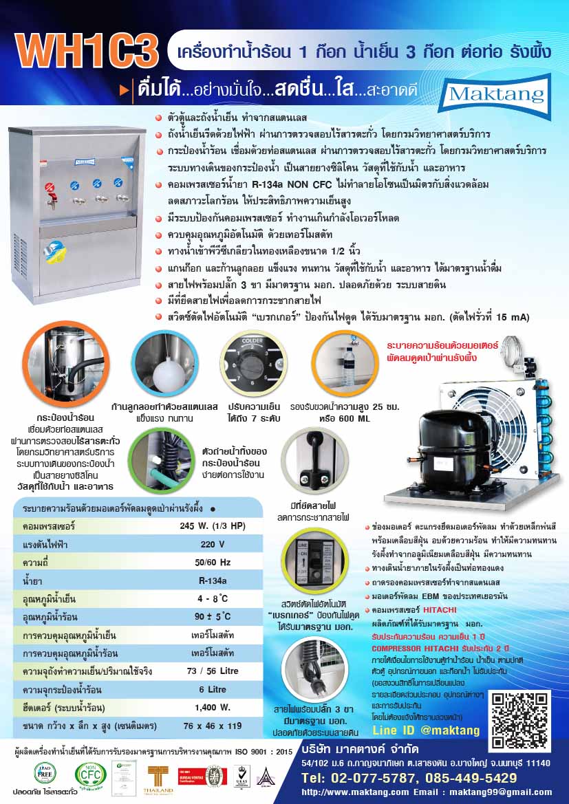 - เครื่องทำน้ำเย็นน้ำร้อน น้ำเย็น รุ่น WH1C3 มีก๊อกน้ำร้อน 1 ก๊อก ก๊อกน้ำเย็น 3 ก๊อก ใช้คอมเพรสเซอร์ HITACHI 270 W. (1/3 Hp.) อุณหภูมิน้ำเย็น 4-8 องศาเซลเซียส ความจุถังน้ำเย็น 70 Lt.ใช้ได้จริง 45 Lt.ใช้ฮิตเตอร์ 1400 W.อุณหภูมิน้ำร้อน 90+-5 องศาเซลเซียส ความจุถังน้ำร้อน 6 Lt. ขนาด (ก x ล x ส) 76 x 46 x 119 ซม.