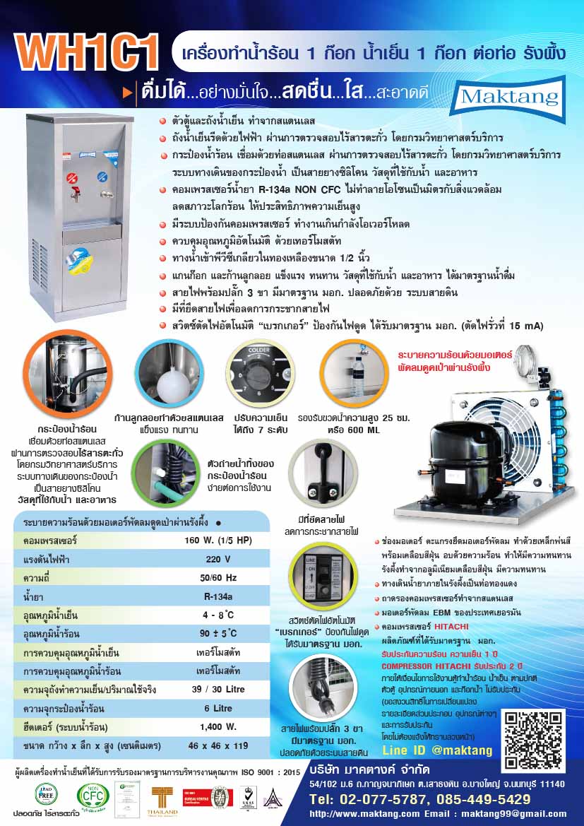 - เครื่องทำน้ำเย็นน้ำร้อน น้ำเย็น รุ่น WH1C1 มีก๊อกน้ำร้อน 1 ก๊อก ก๊อกน้ำเย็น 1 ก๊อก ใช้คอมเพรสเซอร์ HITACHI 160 W. (1/5 Hp.) อุณหภูมิน้ำเย็น 4-8 องศาเซลเซียส ความจุถังน้ำเย็น 37 Lt.ใช้ได้จริง 24 Lt.ใช้ฮิตเตอร์ 1400 W.อุณหภูมิน้ำร้อน 90+-5 องศาเซลเซียส ความจุถังน้ำร้อน 6 Lt. ขนาด (ก x ล x ส) 46 x 46 x 119 ซม.