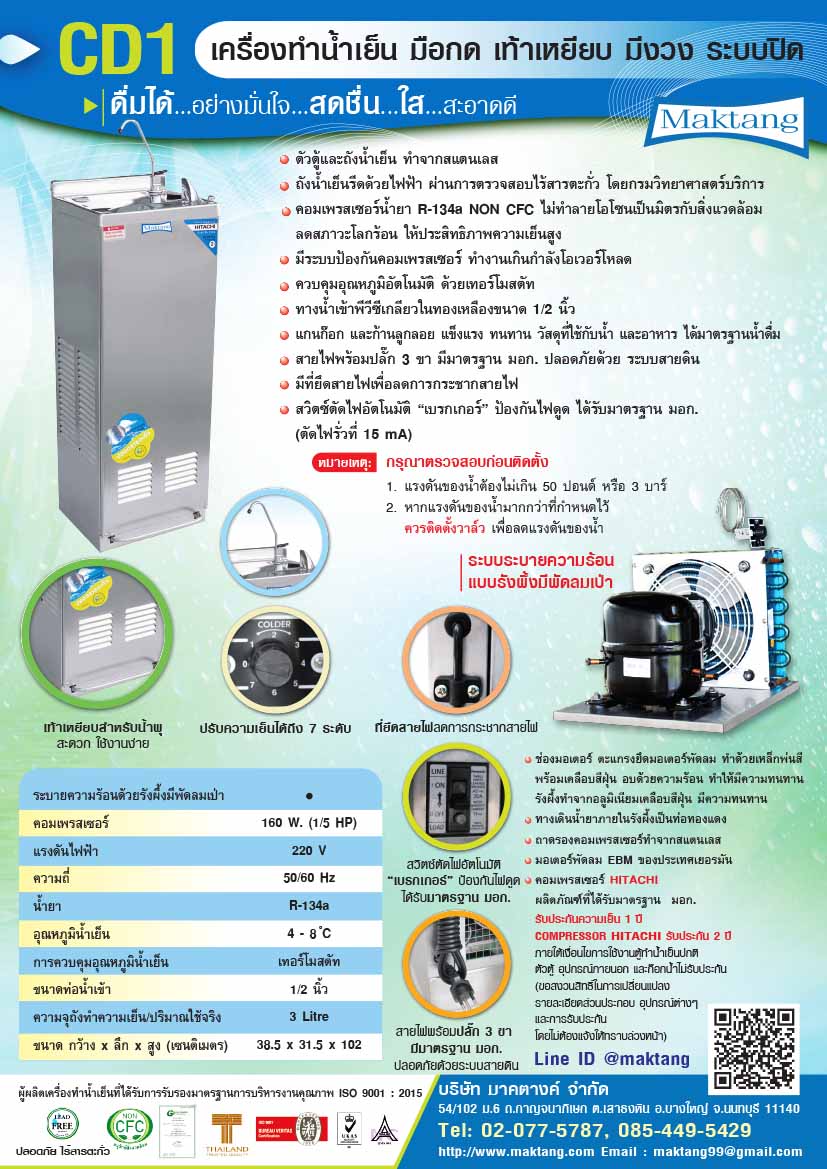 - ตู้ทำน้ำเย็นมือกด ตู้ทำน้ำเย็นเท้าเหยียบ รุ่น CD1 ก๊อกน้ำเย็น(น้ำพุ่ง1 ก็อกงวงช้าง1) 2 ก๊อก ใช้คอมเพรสเซอร์ HITACHI 160 W. (1/5 Hp.) อุณหภูมิน้ำเย็น 4-8 องศาเซลเซียส ความจุถังน้ำเย็น 3 Lขนาด (ก x ล x ส) 38.5 x 31.5 x 102 ซม.