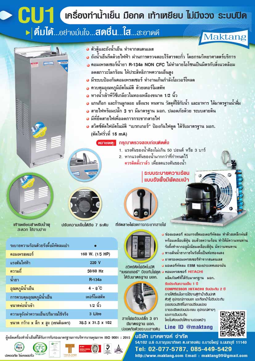 - ตู้ทำน้ำเย็นมือกด ตู้ทำน้ำเย็นเท้าเหยียบ รุ่น CU1 ก๊อกน้ำเย็น(น้ำพุ่ง) 1 ก๊อก ใช้คอมเพรสเซอร์ HITACHI 160 W. (1/5 Hp.) อุณหภูมิน้ำเย็น 4-8 องศาเซลเซียส ความจุถังน้ำเย็น 3 Lขนาด (ก x ล x ส) 38.5 x 31.5 x 102 ซม.