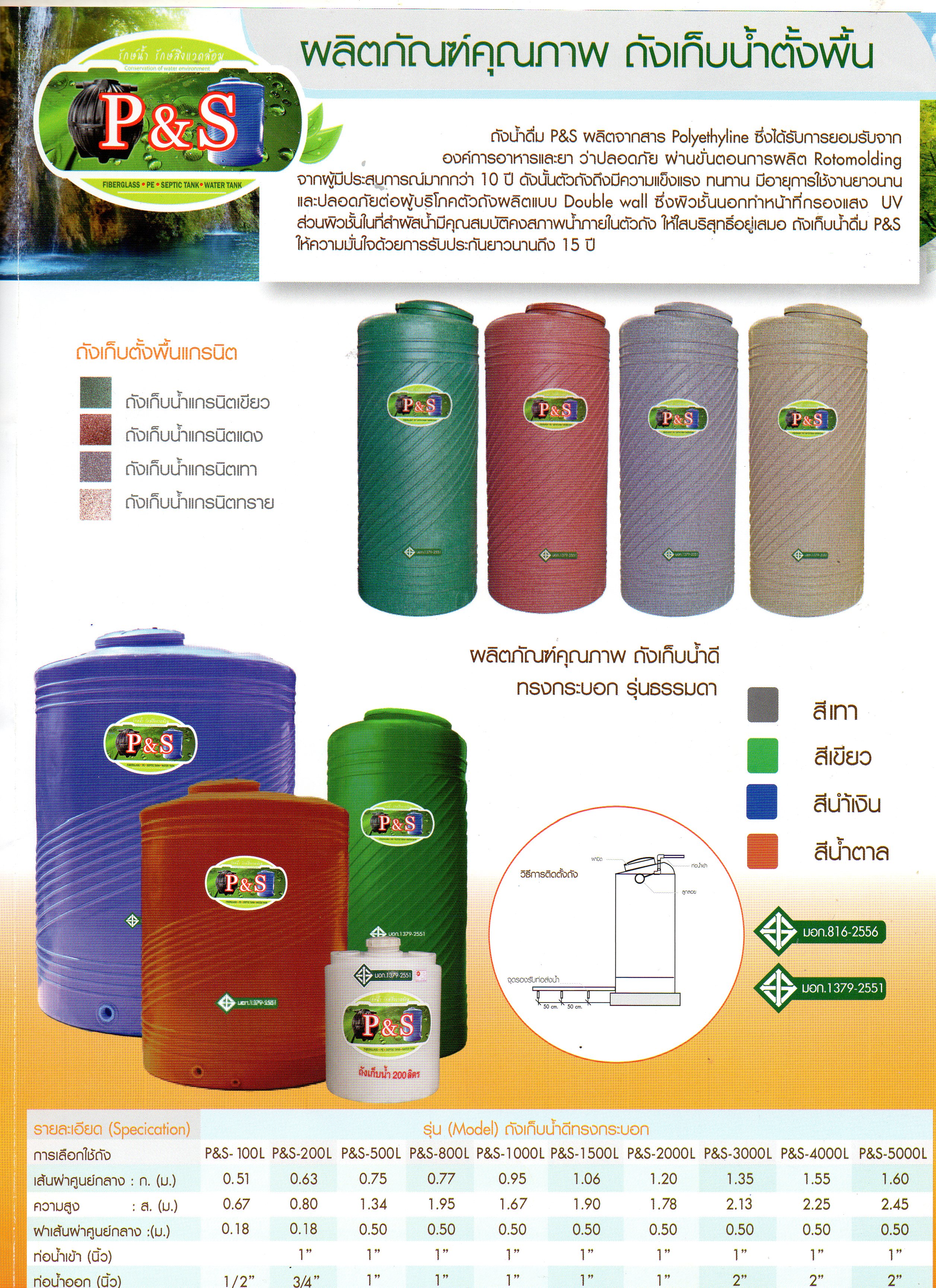 แท้งค์น้ำ PE ตราP&S (พีแอนด์เอส) หรือถังน้ำดื่ม P&S ผลิตจากสาร Polyethyline ซึ่งได้รับการยอมรับจากองค์การอาหารและยาว่าปลอดภัย ผ่านขั้นตอนการผลิต Rotomolding จากผู้มีประสบการณ์มากกว่า 10 ปี ดังนั้น ตัวถังถึงมีความแข็งแรง ทนทาน มีอายุการใช้งานยาวนานและปลอดภัยต่อผู้บริโภค ตัวถังผลิตแบบ Double Wall ซึ่งผิวชั้นนอกทำหน้าที่กรองแสง UV ส่วนผิวชั้นในที่สัมผัสน้ำ มีคุณสมบัติคงสภาพน้ำภายในตัวถัง ให้ใสบริสุทธิ์อยู่เสมอ ถังเก็บน้ำดื่มPE P&S ให้ความมั่นใจด้วยการรับประกันยาวนานถึง 15 ปี บริการ จัดส่ง ฟรี ในเขต กรุงเทพฯ และ ปริมณฑล