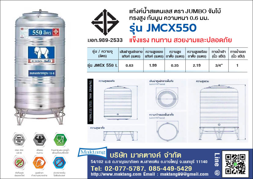 แท้งค์น้ำสแตนเลสตราช้างJUMBO หรือตราช้าง ทรงสูงก้นนูน รุ่นJMCX550