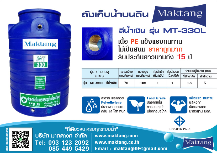 แท้งค์น้ำPE Maktang MT-330 สีน้ำเงิน แต่บางคนเรียกแท้งค์น้ำสีฟ้า