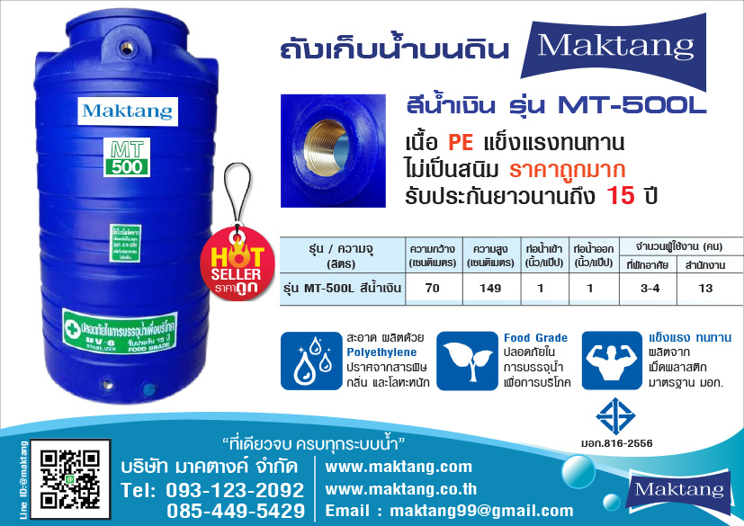 แท้งค์น้ำPE Maktang MT-500 สีน้ำเงิน หรือถังพลาสติก