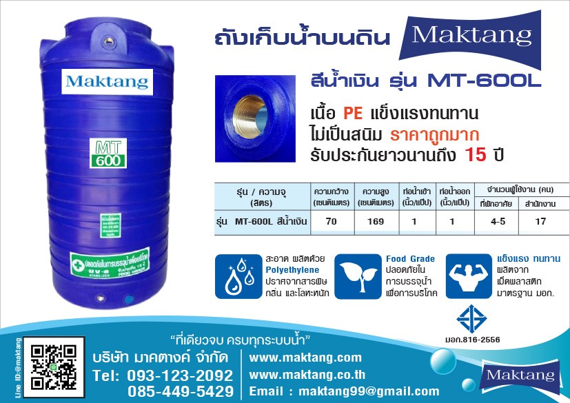 แท้งค์น้ำPE Maktang MT-600 สีน้ำเงิน หรือถังสำรองน้ำ