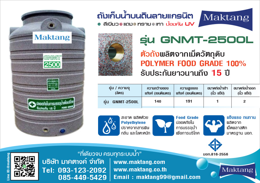 แท้งค์น้ำ PE Maktangรุ่นMGN-10000 ลายแกรนิต สีเทาขนาดความจุ 10000 ลิตรขนาดความกว้าง 214 เซนติเมตรความสูง 317 เซนติเมตรท่อน้ำเข้าขนาด 1 นิ้วท่อน้ำออกขนาด 2 นิ้วป้องกันการเกิคตะไคร่น...
