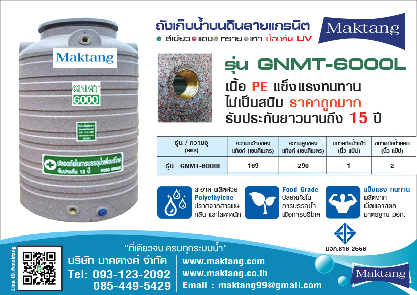 แท้งค์น้ำ PE Maktangรุ่นMGN-10000 ลายแกรนิต สีเทาขนาดความจุ 10000 ลิตรขนาดความกว้าง 214 เซนติเมตรความสูง 317 เซนติเมตรท่อน้ำเข้าขนาด 1 นิ้วท่อน้ำออกขนาด 2 นิ้วป้องกันการเกิคตะไคร่น...
