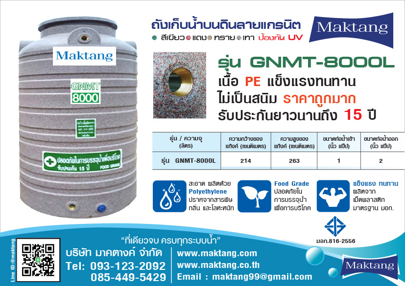 แท้งค์น้ำ PE Maktangรุ่นMGN-10000 ลายแกรนิต สีเทาขนาดความจุ 10000 ลิตรขนาดความกว้าง 214 เซนติเมตรความสูง 317 เซนติเมตรท่อน้ำเข้าขนาด 1 นิ้วท่อน้ำออกขนาด 2 นิ้วป้องกันการเกิคตะไคร่น...