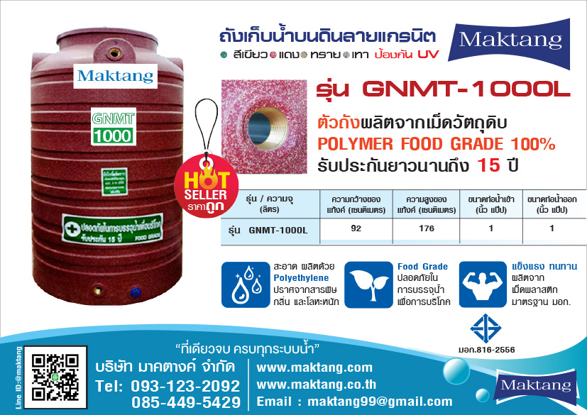 • แท้งค์น้ำ PE Maktang รุ่น MGN-1500 ลายแกรนิต สีแดง