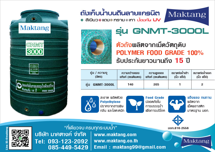 แท้งค์น้ำ PE Maktangรุ่นMGN-10000 ลายแกรนิต สีเขียวขนาดความจุ 10000 ลิตรขนาดความกว้าง 214 เซนติเมตรความสูง 317 เซนติเมตรท่อน้ำเข้าขนาด 1 นิ้วท่อน้ำออกขนาด 2 นิ้วป้องกันการเกิคตะไคร...