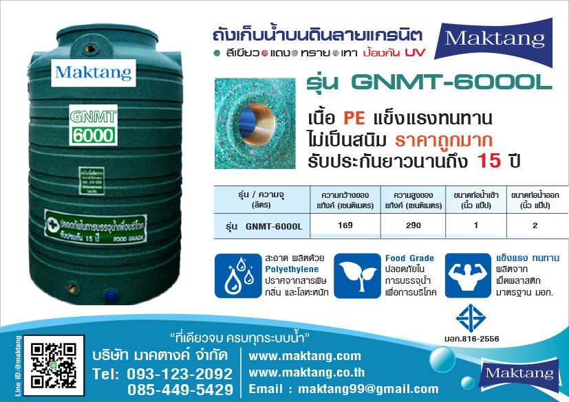 แท้งค์น้ำ PE Maktangรุ่นMGN-10000 ลายแกรนิต สีเขียวขนาดความจุ 10000 ลิตรขนาดความกว้าง 214 เซนติเมตรความสูง 317 เซนติเมตรท่อน้ำเข้าขนาด 1 นิ้วท่อน้ำออกขนาด 2 นิ้วป้องกันการเกิคตะไคร...