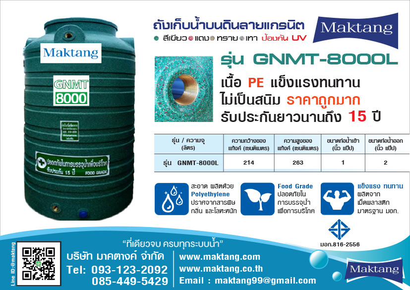 แท้งค์น้ำ PE Maktangรุ่นMGN-10000 ลายแกรนิต สีเขียวขนาดความจุ 10000 ลิตรขนาดความกว้าง 214 เซนติเมตรความสูง 317 เซนติเมตรท่อน้ำเข้าขนาด 1 นิ้วท่อน้ำออกขนาด 2 นิ้วป้องกันการเกิคตะไคร...