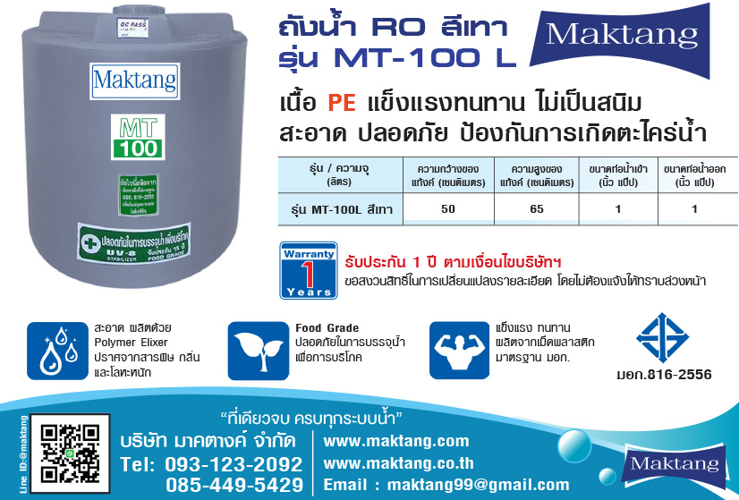 แท้งค์น้ำ PE Maktang 1000 ลิตร สีเทา MT1000GY -แท้งค์น้ำPE Maktang สีเทา-แท้งค์น้ำ PEมีขนาดความจุ 1000 ลิตร-แท้งค์น้ำ PEมีขนาดความกว้าง 92 เซนติเมตร-แท้งค์น้ำ PEมีขนาดความสูง 176 เ...