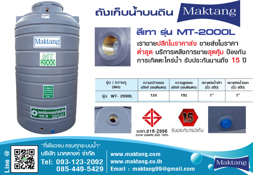 แท้งค์น้ำ PE Maktang 4000 ลิตร สีเทา MT4000GY -แท้งค์น้ำPE Maktang สีเทา-แท้งค์น้ำ PEมีขนาดความจุ 4000 ลิตร-แท้งค์น้ำ PEมีขนาดความกว้าง 165 เซนติเมตร-แท้งค์น้ำ PEมีขนาดความสูง 210 ...