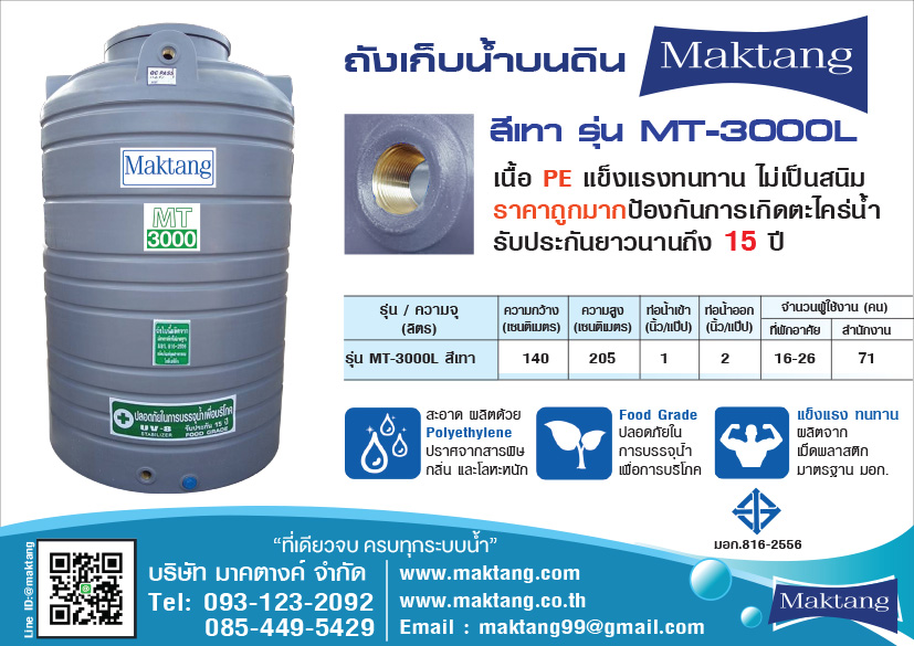 แท้งค์น้ำ PE Maktang 4000 ลิตร สีเทา MT4000GY -แท้งค์น้ำPE Maktang สีเทา-แท้งค์น้ำ PEมีขนาดความจุ 4000 ลิตร-แท้งค์น้ำ PEมีขนาดความกว้าง 165 เซนติเมตร-แท้งค์น้ำ PEมีขนาดความสูง 210 ...