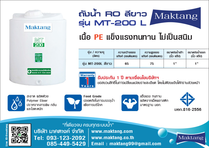 แท้งค์น้ำ PE Maktang 200 ลิตร สีขาว MT-200