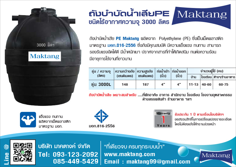 ถังบำบัดน้ําเสีย ตรา Maktang ผลิตจาก POLYMER ELIXIR (PE) ซึ่งเป็นเม็ดพลาสติกที่ได้รับมาตรฐาน มอก. 816-2556