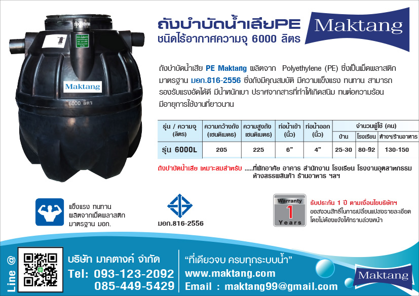 ถังบำบัดน้ําเสีย ตรา Maktang ผลิตจาก POLYMER ELIXIR (PE) ซึ่งเป็นเม็ดพลาสติกที่ได้รับมาตรฐาน มอก. 816-2556
