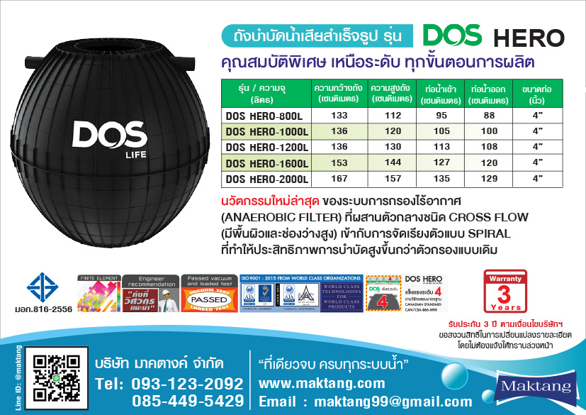 ข้อมูลเฉพาะของ ถังบำบัดน้ําเสีย DOS 800 ลิตร รุ่น HERO