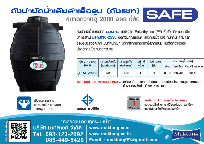 ข้อมูลเฉพาะของ ถังแซท ชนิดไร้อากาศ ตรา SAFE 2000 ลิตร