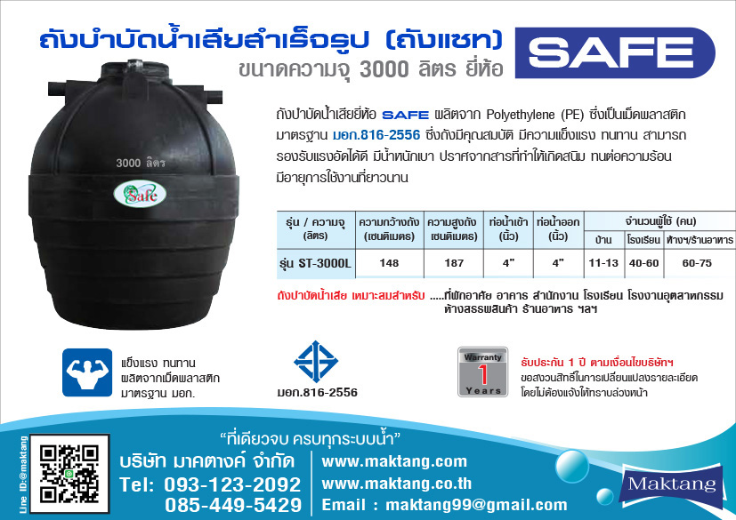 ข้อมูลเฉพาะของ ถังแซท ชนิดไร้อากาศ ตรา SAFE 3000