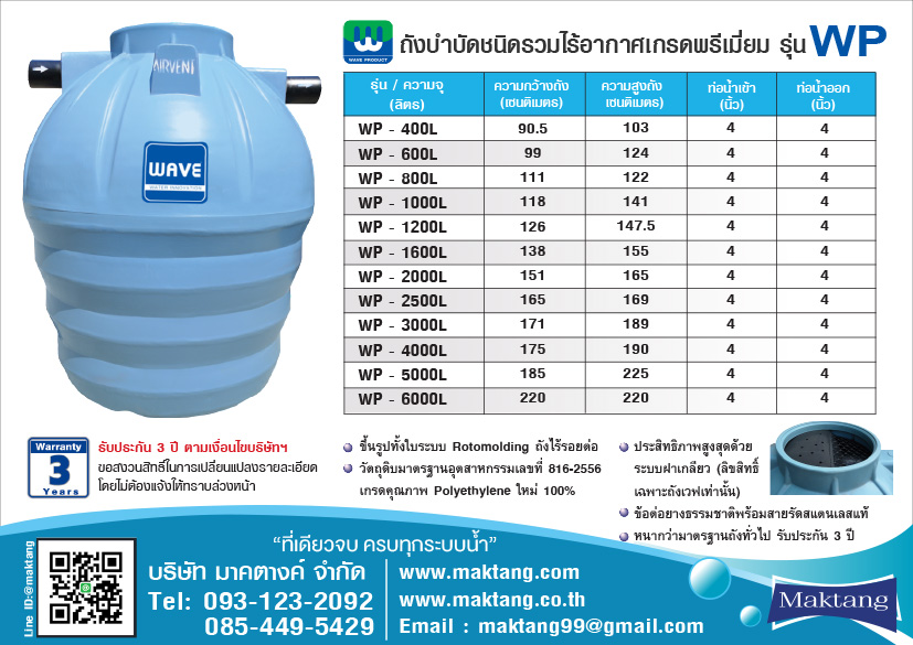 การรับประกัน ถังบำบัด ชนิดรวมไร้อากาศเกรดพรีเมี่ยม ตรา WAVE รุ่น WP