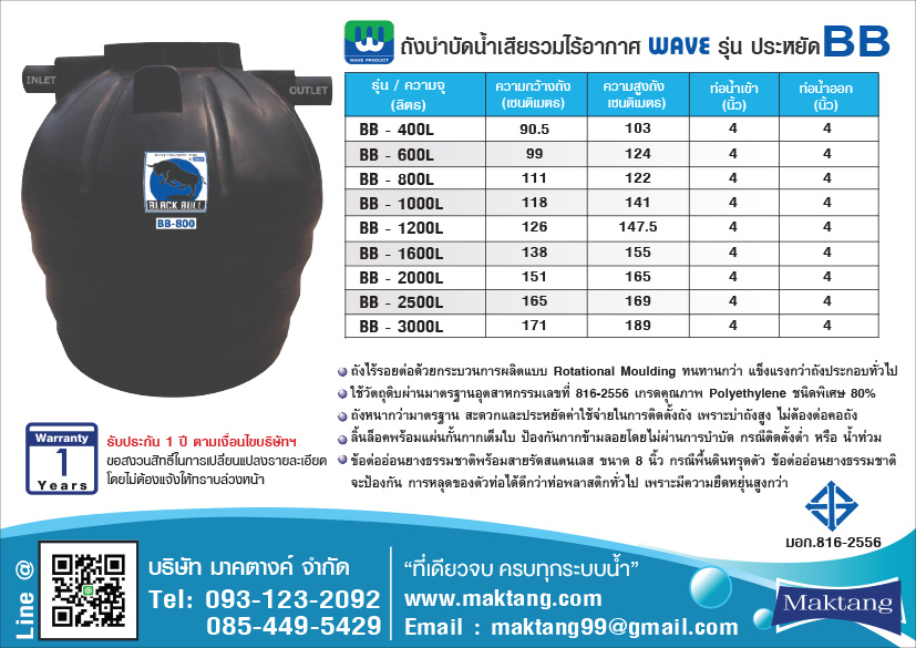 คุณสมบัติพิเศษของ ถังบำบัด ชนิดรวมไร้อากาศ ตรา WAVE รุ่น BB