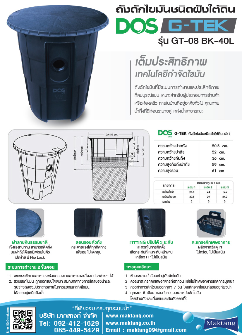 ข้อมูลเฉพาะของ ถังดักไขมันแบบฝังดิน ขนาด 40 ลิตร ตรา DOS G-TEK รุ่น GT-08 BK-40L