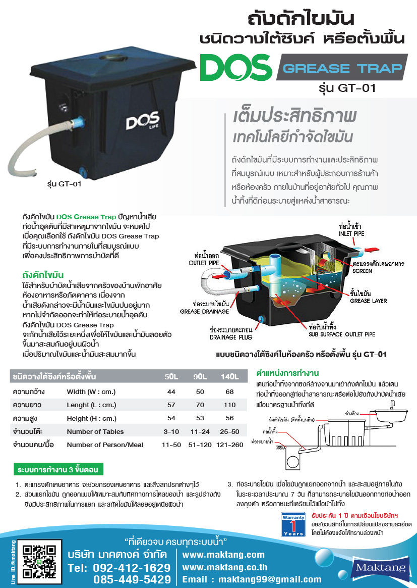 การรับประกัน ถังดักไขมันแบบติดใต้ซิงค์ ขนาด 140 ลิตร ตรา DOS Grease Trap รุ่น GT-01 BK-140L