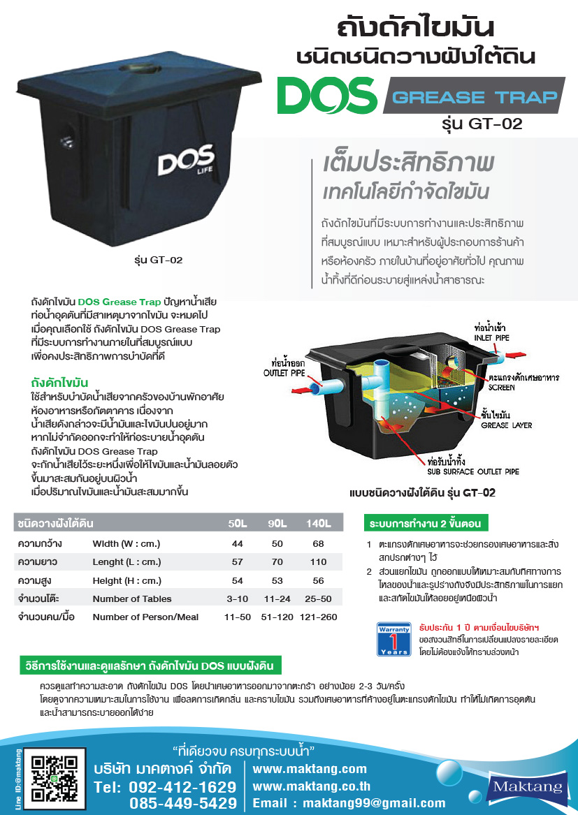 การรับประกัน ถังดักไขมันแบบฝังดิน ขนาด 140 ลิตร ตรา DOS Grease Trap รุ่น GT-02 BK-140L