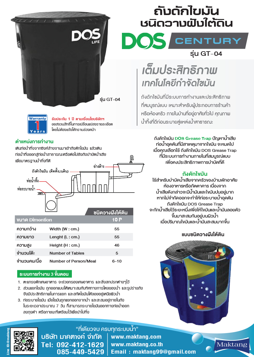 การรับประกัน ถังดักไขมันแบบฝังดินแบบฝังดิน ตรา DOS Century รุ่น GT-04 BK-10P