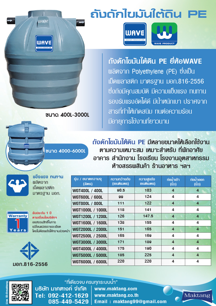 การรับประกัน ถังดักไขมัน ตรา WAVE รุ่น WGT