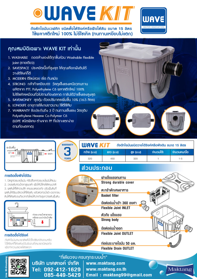 ข้อมูลเฉพาะของ ถังดักไขมันขนาดเล็ก ขนาด 15 ลิตร ตรา WAVE รุ่น WAVEKIT-15L