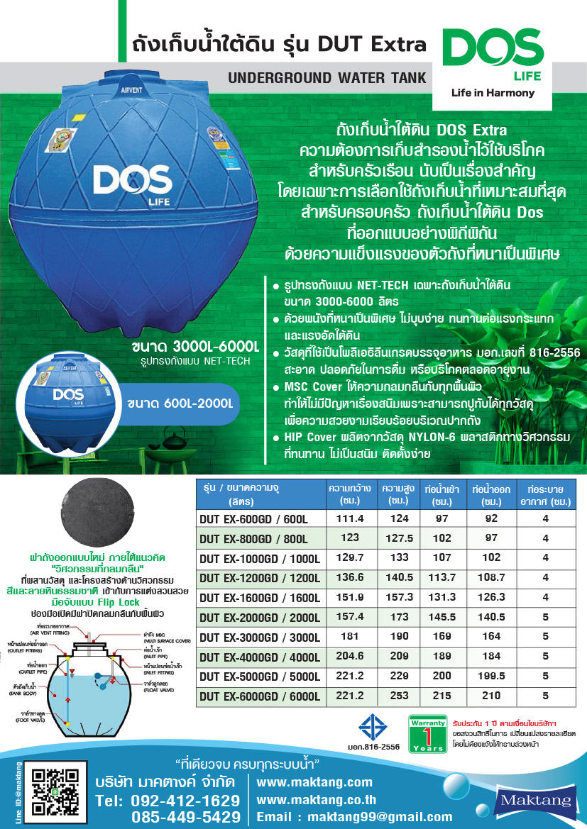การรับประกัน ถังเก็บน้ำใต้ดิน PE DOS EXTRA ขนาด 600 ลิตร รุ่น DUT600EX