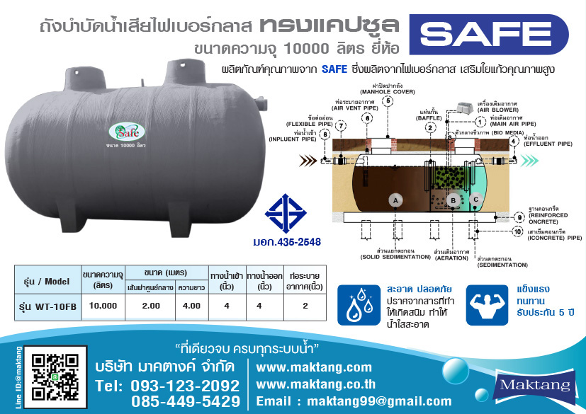 ถังบำบัดน้ำเสียไฟเบอร์กลาส 10000 ลิตร ตรา Safe รุ่น WT10000FB