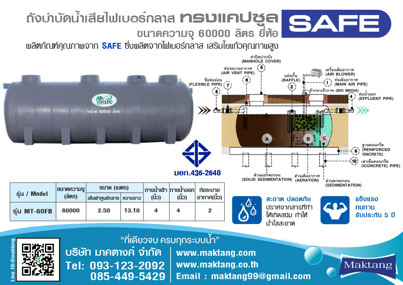 ข้อมูลเฉพาะของ ถังบำบัดน้ำเสียไฟเบอร์กลาส 60000 ลิตร ตรา Safe