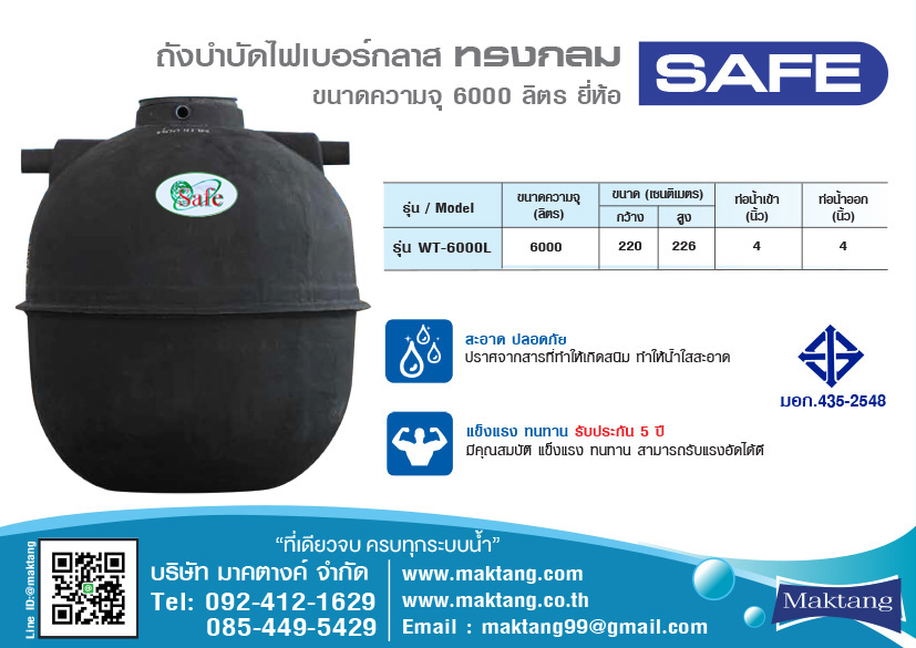 ถังบำบัดน้ำเสียไฟเบอร์กลาส 6000 ลิตร ตรา Safe รุ่น WT6000L