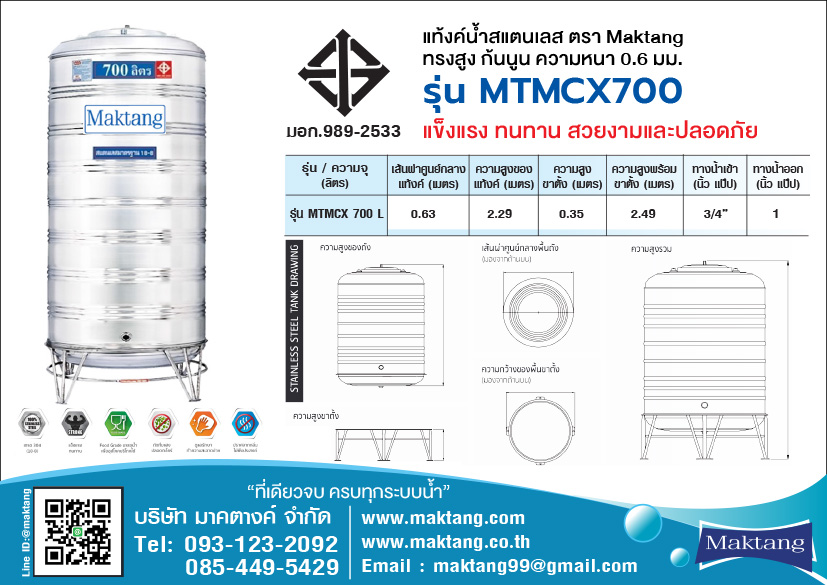 การรับประกัน แทงค์น้ำสแตนเลส 700 ลิตร Maktang MTMCX700 ทรงสูง