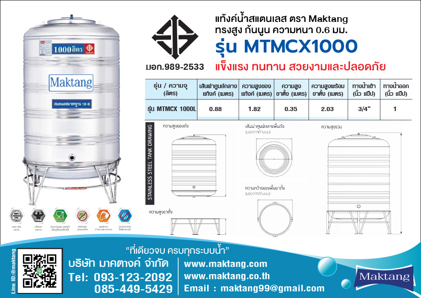 การรับประกัน แทงค์น้ำสแตนเลส 1000 ลิตร Maktang MTMCX1000 ทรงสูง