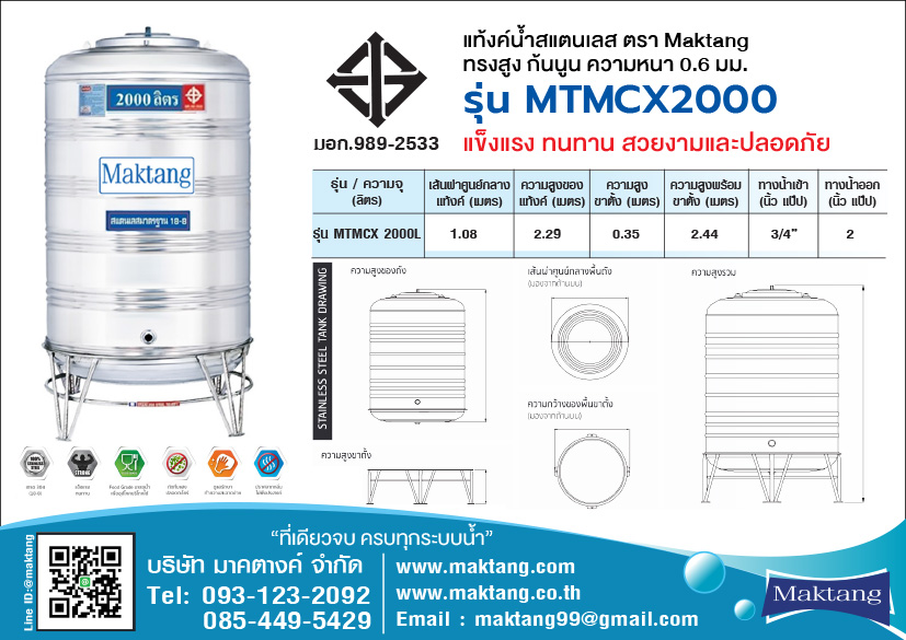 การรับประกัน แทงค์น้ำสแตนเลส 2000 ลิตร Maktang MTMCX2000 ทรงสูง